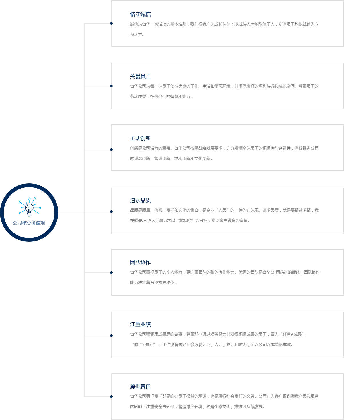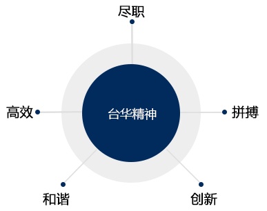 自2001年發展至今,臺華公司從小到大、從弱到強,臺華人用辛勞的汗水曾澆灌出了“主動、責任、紀律、團結”的精 神之花。2014年,為了適應公司新的發展要求,臺華人提出了新企業精神“盡職、高效、拼搏、和諧、創新”,并編入公司管 理制度及相關規范性文件。