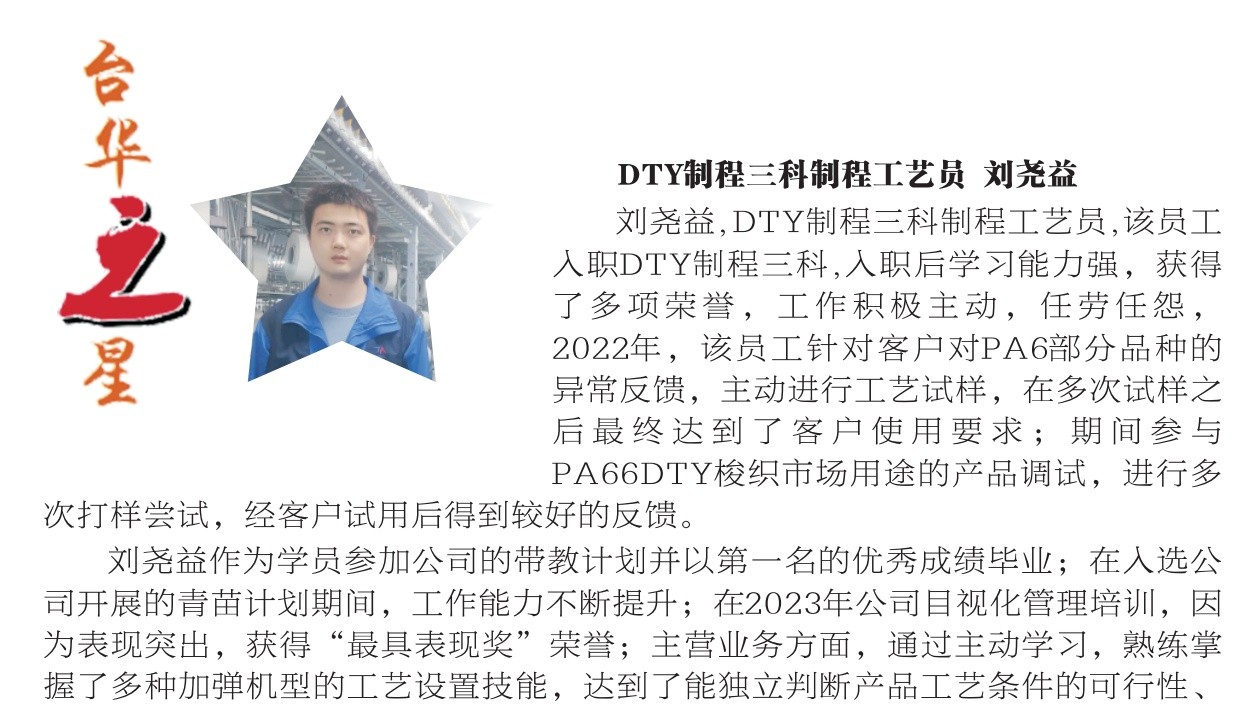 為獎勵在各個層級上工作表現突出的個人和團隊,公司擁有系統完備的評優體系,包括“臺華之星”、“優秀班組”、“最佳新人”、“優秀帶教員”、 “美麗工廠”、 “最佳提案”等,讓每一位員工的付出都能夠得到公司的回報與認可。