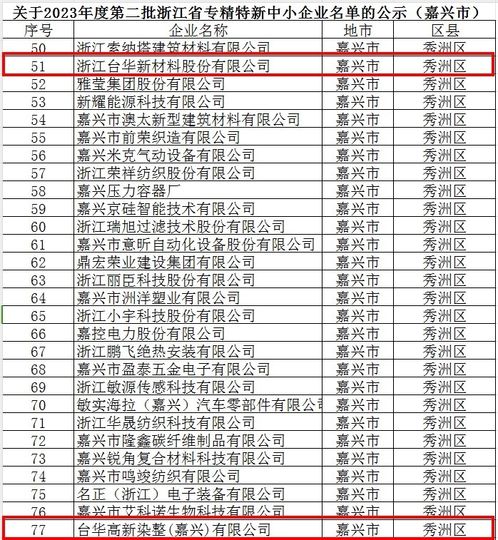 近日,嘉興市經(jīng)濟和信息化局發(fā)布了《關(guān)于2023年度第二批浙江省專精特新中小企業(yè)名單的公示(嘉興市)》,浙江臺華新材料股份有限公司和臺華高新染整(嘉興)有限公司上榜。