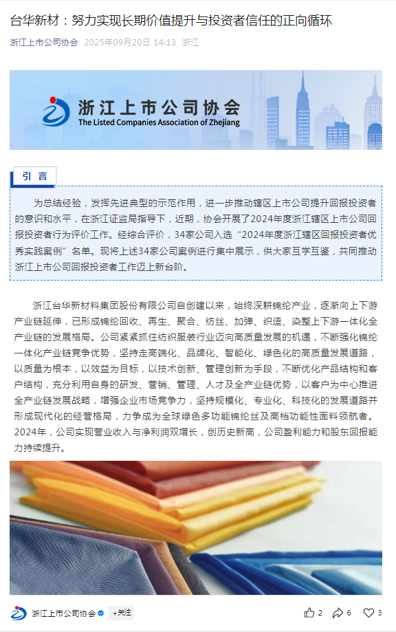 9月20日,浙江上市公司協(xié)會(huì)在其官方媒介發(fā)布了《臺(tái)華新材:努力實(shí)現(xiàn)長期價(jià)值提升與投資者信任的正向循環(huán)》一文,據(jù)了解,在浙江證監(jiān)局指導(dǎo)下,浙江上市公司協(xié)會(huì)開展了2024年度浙江轄區(qū)上市公司回報(bào)投資者行為評(píng)價(jià)工作。經(jīng)綜合評(píng)價(jià),34家公司入選“2024年度浙江轄區(qū)回報(bào)投資者優(yōu)秀實(shí)踐案例”名單,臺(tái)華新材在此名單內(nèi)。