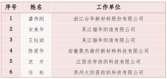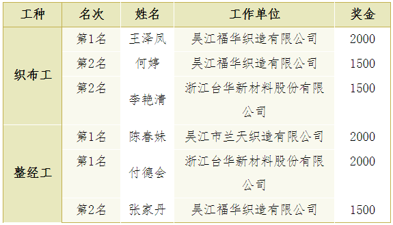(1)織布和整經(jīng)第1-6名授予“全國(guó)紡織行業(yè)技術(shù)能手”榮譽(yù)稱(chēng)號(hào),具體名單如下: